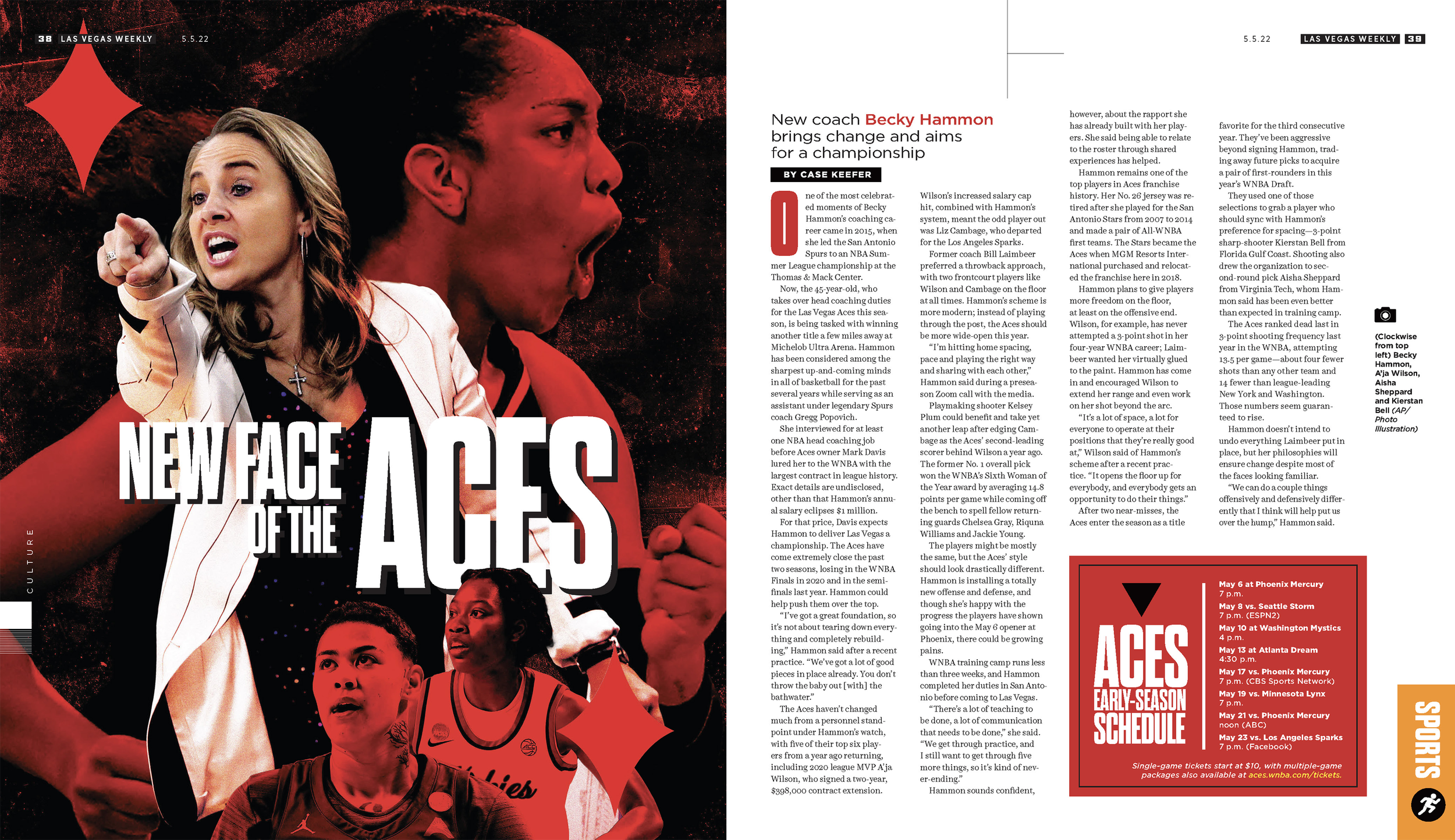 As Senior Designer at Las Vegas Weekly, I designed across digital, social, print, and editorial platforms for a city in the middle of a professional sports boom. I was there for the inaugural seasons of the Aces, Vegas Golden Knights, Raiders, and the arrival of Formula 1, contributing to coverage that spanned Michelob Ultra Arena, T-Mobile Arena, Allegiant Stadium, and the Las Vegas Strip circuit.