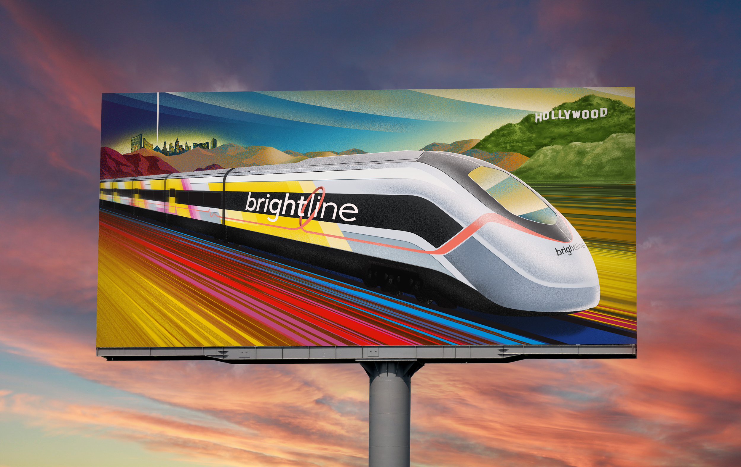 Brightline came to me with a commission for their landmark groundbreaking ceremony, a celebration marking the start of construction on their new high-speed rail line connecting Las Vegas to Rancho Cucamonga. I created an illustration for display at the event, one that pays homage to the bold, industrial-style posters of the early 20th century. The piece captures the spirit of progress, innovation, and the excitement of connecting two vibrant destinations through modern rail travel. Created in Procreate and finished in Adobe Photoshop.