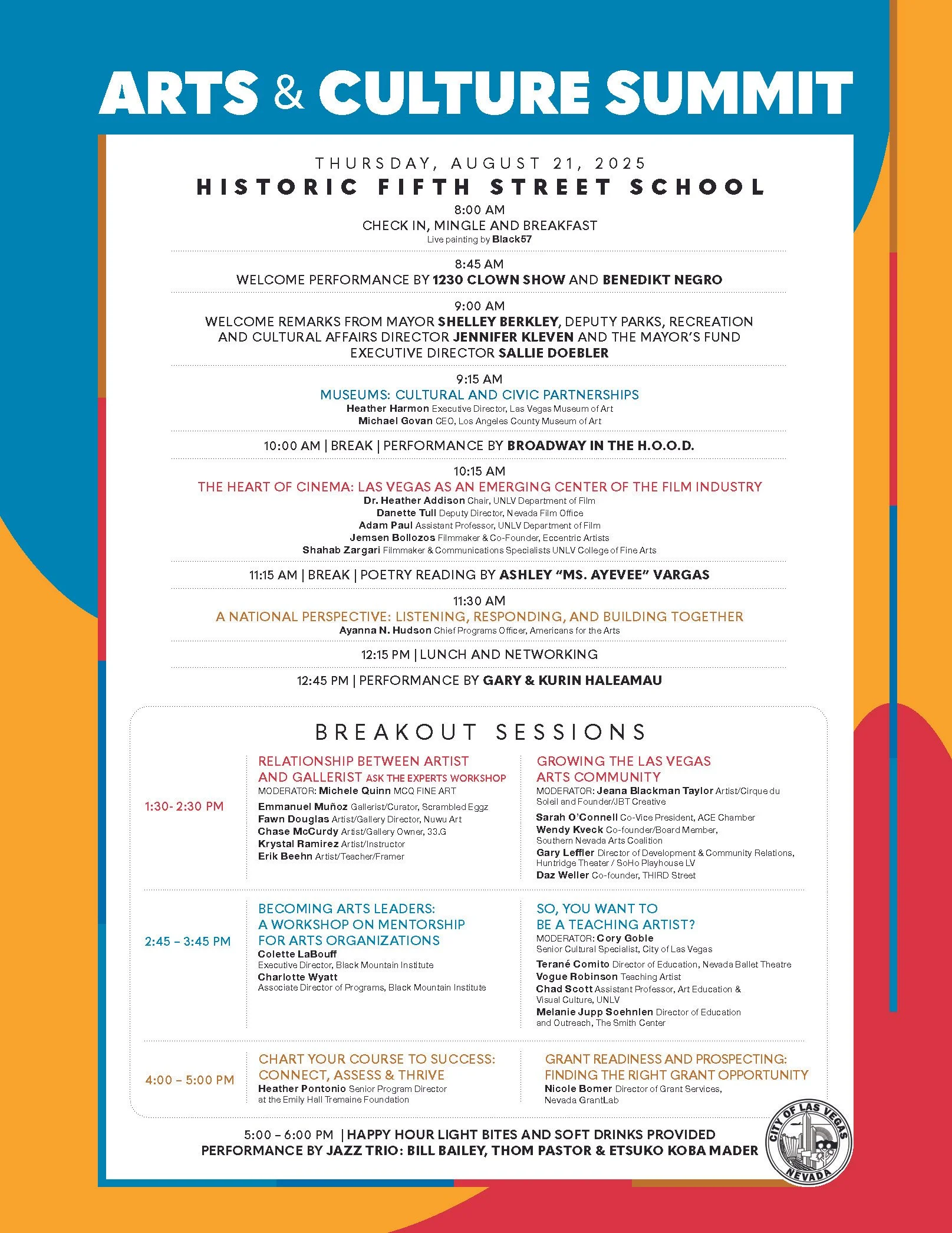 The City of Las Vegas approached me to lead the branding and design for their highly anticipated 2025 Arts & Culture Summit. For this project, I developed a cohesive visual identity that extended across a variety of materials, including a 25-page program booklet, identification badges, posters, and additional event assets. Every piece was thoughtfully designed to reflect the vibrancy and creativity of Las Vegas’ arts community.