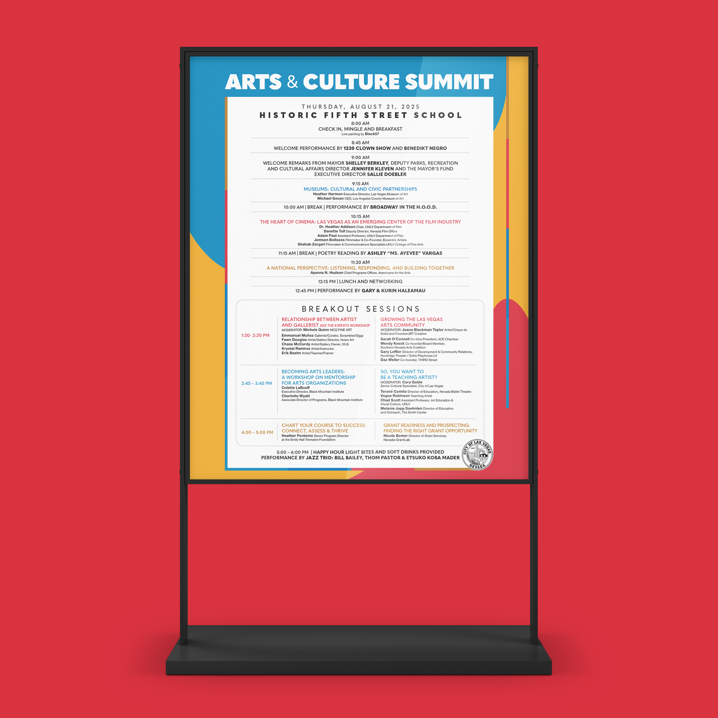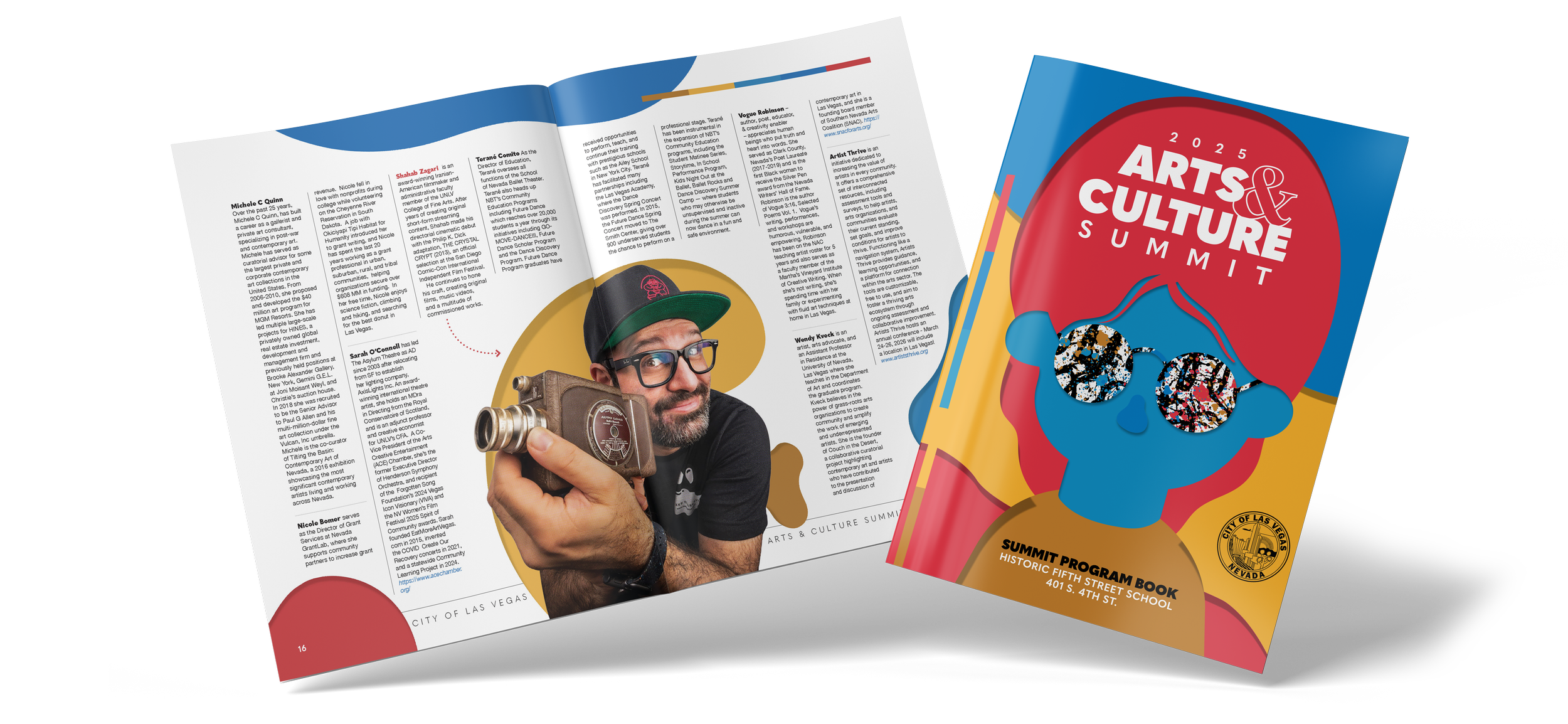 The City of Las Vegas tapped me to lead branding and design for their 2025 Arts & Culture Summit. I developed a visual identity that spanned a 25-page program booklet, badges, posters, and additional event assets, all built to reflect the vibrancy of Las Vegas' arts community. Below are final designs and a few moments from the event itself.